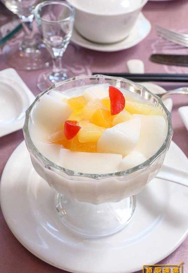 以600c.c.水、150克砂糖、三花淡奶及少许杏仁露,搅拌均匀成糖水;取出杏仁豆腐切丁,加入糖水,放上什锦水果即完成。