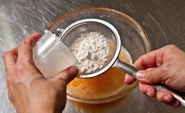 将糖粉加入1颗全蛋、1颗蛋白混合的蛋汁,低筋面粉过筛后拌匀。