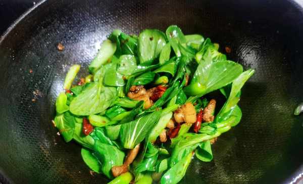 第五步:待菜梗炒至断生后,接着将菜叶放入锅中,再次翻炒大约10秒左右,即可关火出锅。这道上海青炒肉就做好了,做法特别简单,清脆爽口,实在是超下饭,大家赶快动手试试哦!