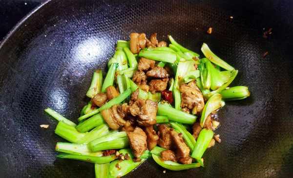 第四步:待肉炒出香味后,接着将备好的菜梗倒入炒锅中,然后开大火开始翻炒,翻炒几下后,再次加入少许食用盐和少许鸡精,翻炒至菜梗断生,即可。