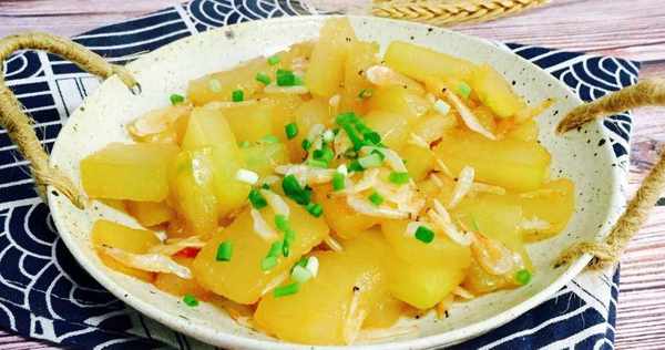 2、起锅烧油,放入姜片爆香,倒入冬瓜大火翻炒,炒至冬瓜面颜色金黄,加入适量盐、蚝油调味,翻炒均匀后倒入适量热水,小火煮5分钟。冬瓜软烂后放入虾皮,翻炒均匀后大火收汁,撒上葱花即可出锅。