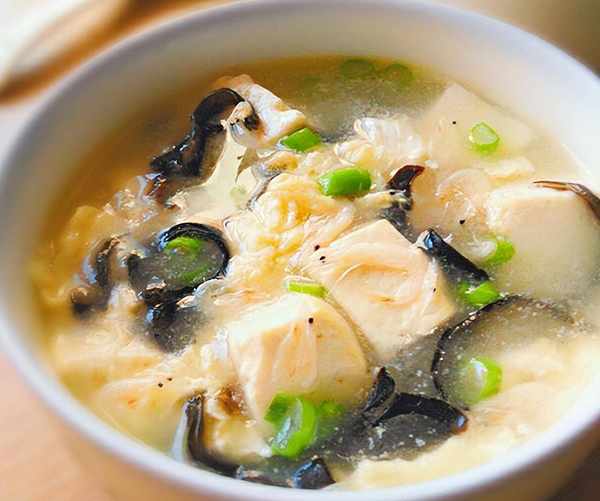 2、起锅烧油,油热后放入葱花爆香,倒入虾皮小火炒出香味,倒入适量的热水烧开,放入豆腐块、木耳丝煮3分钟,把鸡蛋液转圈倒入锅中,形成蛋花后加入适量盐调味,淋入水淀粉勾芡,汤汁浓郁后淋上香油即可。