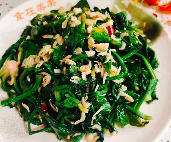 2、锅里放一勺猪油,烧热后放入姜蒜、干辣椒爆香,倒入虾皮炒出香味,放入菠菜大火翻炒1分钟,变软后加入适量盐调味,翻炒均匀后即可出锅。