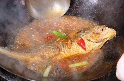 放入黄鱼煎到两面呈金黄,加入葱段、辣椒、酱油、糖、水200c.c.及绍兴酒。