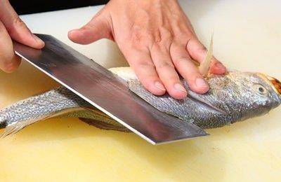 Tips:黄鱼的刀痕要切的够深,却不能断骨,刀痕约3道即可,多了不够美观,也会影响肉质鲜嫩,让鱼肉太老不好吃。