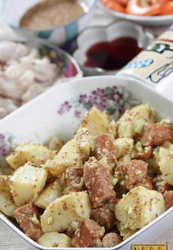 【蜂蜜芥末薯块】材料:马铃薯4颗、德国香肠4根、芥末酱2汤匙、芥末籽酱2汤匙、蜂蜜2汤匙