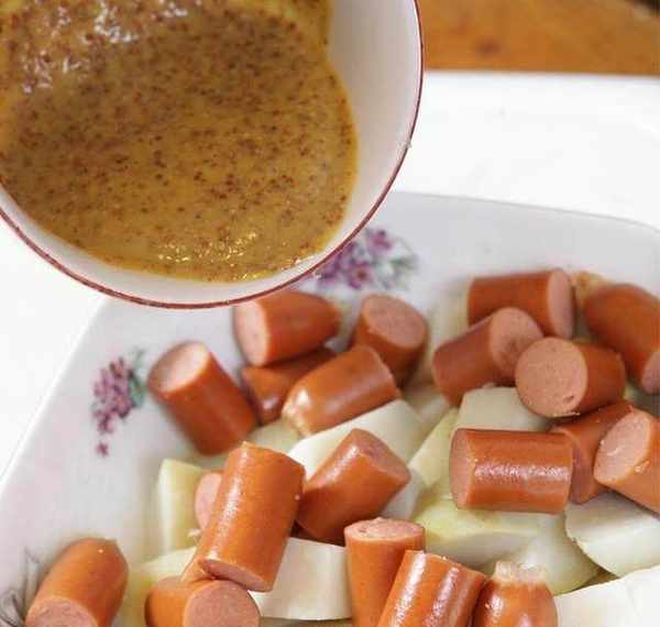 Step3:将芥末酱、芥末籽酱和蜂蜜,用1:1:1的比例混合,这里的分量大概是每一种酱料2汤匙。调好的酱料和马铃薯和香肠中拌匀混合后淋上,最后再放入一些芹菜丁提味即完成。※本食谱约4~6人份。
