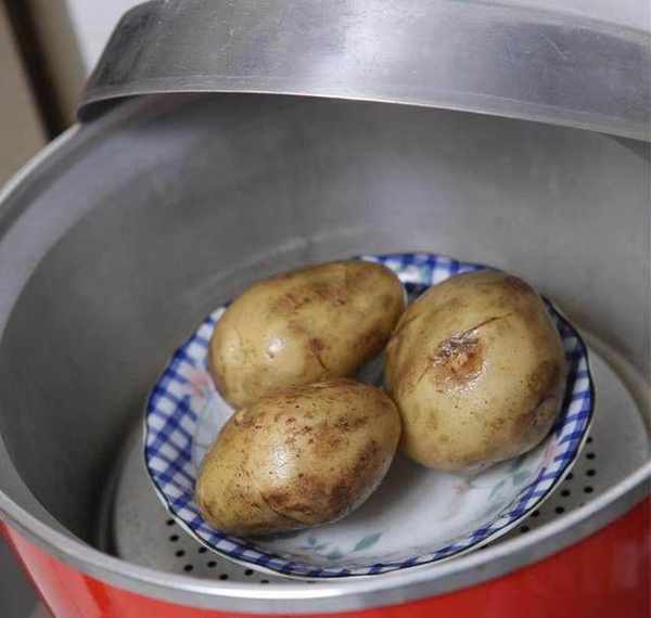 Step1:将马铃薯外皮洗净后整颗放入电锅,外锅倒入大概3~4杯水来蒸,让马铃薯蒸透。Tips:想要知道马铃薯有没有蒸透,可以用叉子叉叉看,叉得进去就可以了。