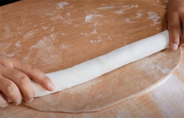 5.稍微的擀两下,整理好形状之后,再刷上一层水,然后从底部开始卷起来。