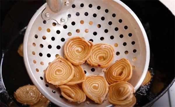 8.油温六成热下锅,看它浮起来之后用筷子多拨动几次,确保它们受热均匀,炸出来的颜色也好看,最后一直炸到像这种变硬又金黄上色的程度就可以出锅了。