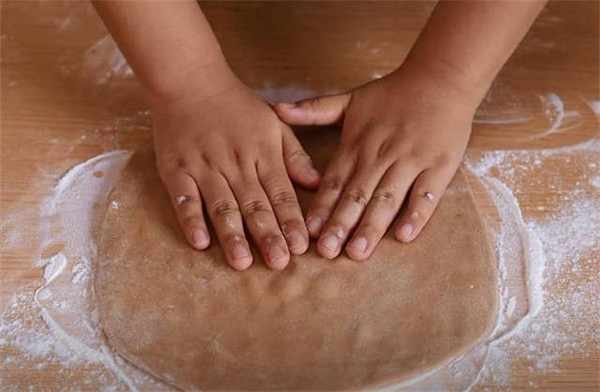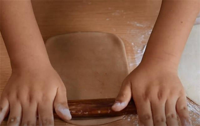 3.案板上撒些干面粉防粘,我们先处理刚才和好的白色面团,轻轻的擀成长方形的饼皮,稍微的把红糖面团再擀一下。