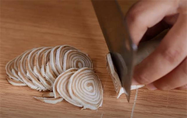 9.面团冻上一个小时之后,可以快速定型,这样切片的时候就可以很薄了,炸出来的形状也会好看很多。