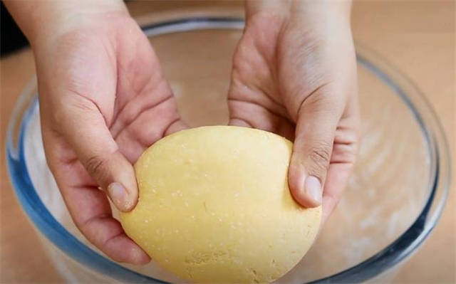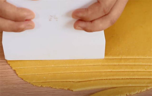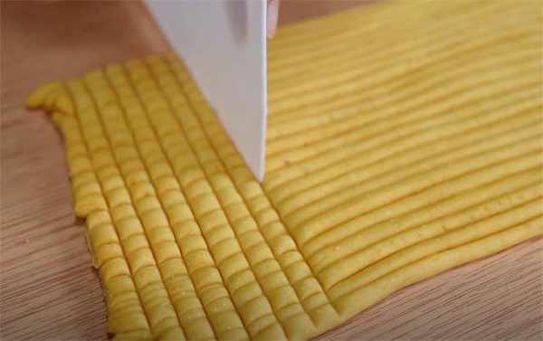 5.现在再来处理黄色的面剂,用擀面杖擀成饼皮,擀好之后我们切成长条。