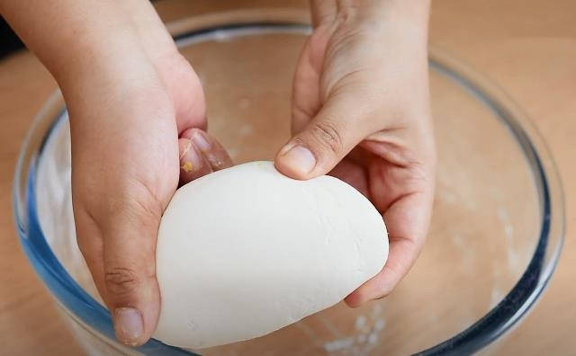 1.先和白色面团,150g面粉,酵母粉放1g,和面的时候用牛奶,我这些用量一共是75g,搅拌到面粉把液体都吸收完,我们就可以开始揉面了,这个面团的含水量很少,所以说前期揉面的时候可能有点费力,最后一直揉到这种光滑匀称的状态就可以了。