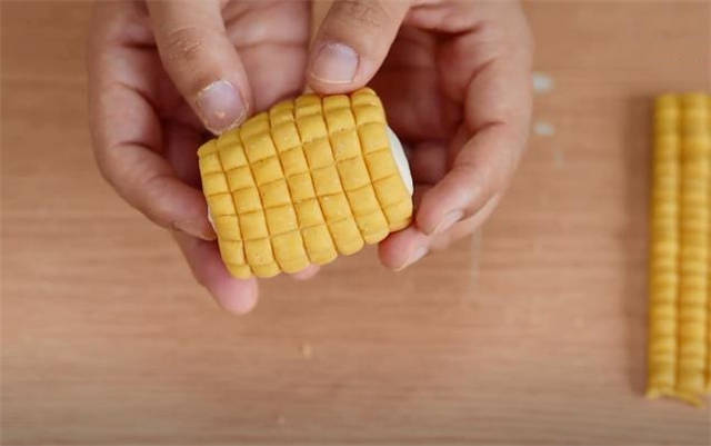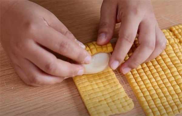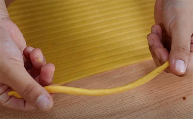 14.做造型的时候一定要把分割好的长条搓圆再拼接,然后压出的纹路会显得更饱满一些,做出来也更好看。