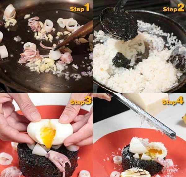 Tips:墨鱼汁可于大型超市购得。若以意大利米烹煮,则风味更佳。