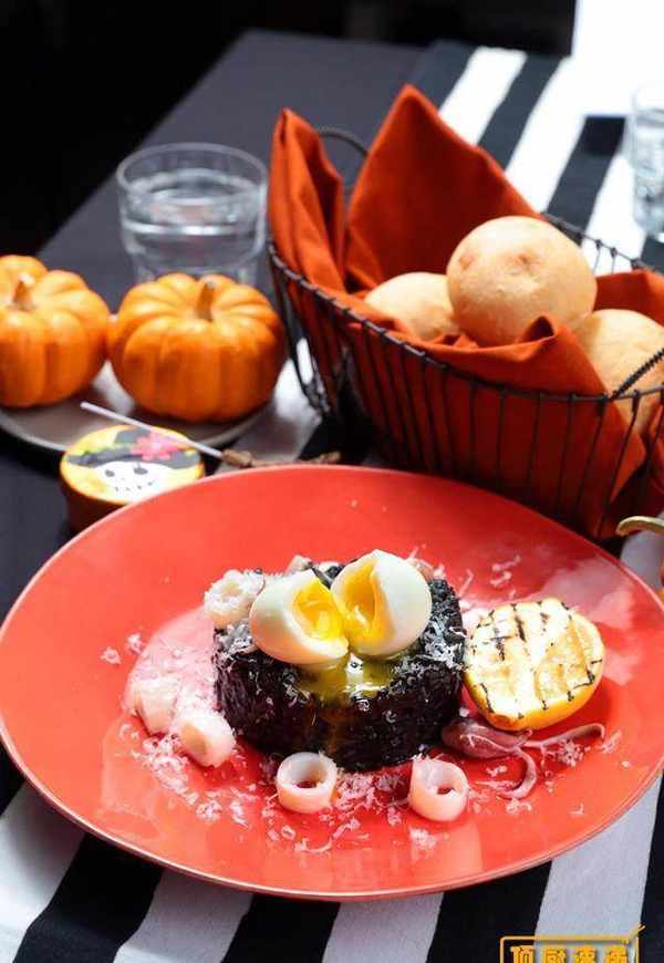 生米80公克、小卷2只、市售墨鱼汁8公克、洋葱半颗、红葱头2颗、大蒜2颗、鲜奶油30公克、溏心蛋2颗、帕马森干酪20公克、黄柠檬1颗、柠檬汁少许、高汤或开水300毫升