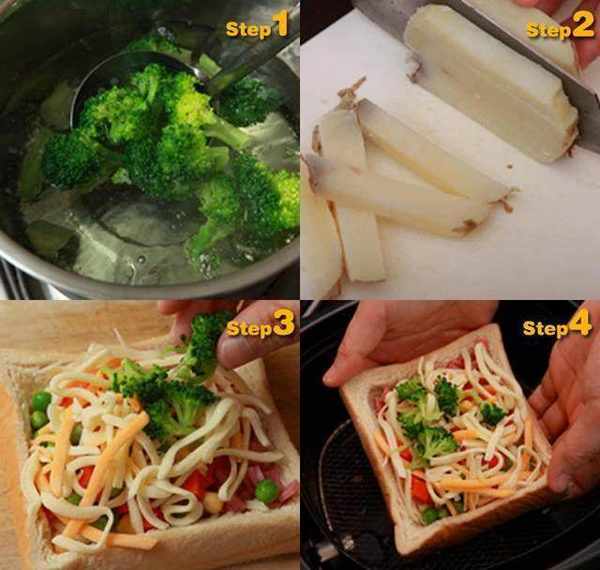 厚片吐司1片、玉米粒1小匙、火腿片半片、起司丝1大把、三色蔬菜1大匙、花椰菜1大朵、马铃薯半颗