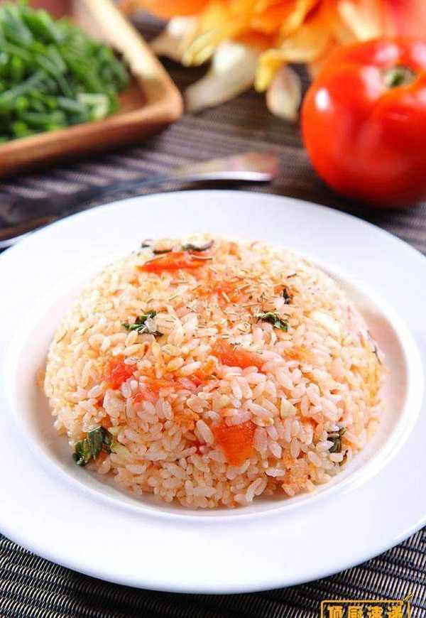 牛番茄洗净后切成小块状。白米洗净后放入电子锅内,并加入切好的番茄和番茄酱。