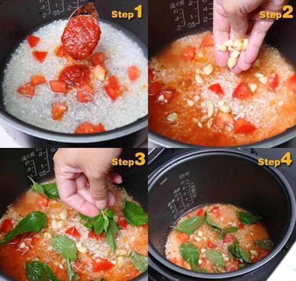 白米120g、牛番茄1颗、罗勒叶5片、蒜末10g