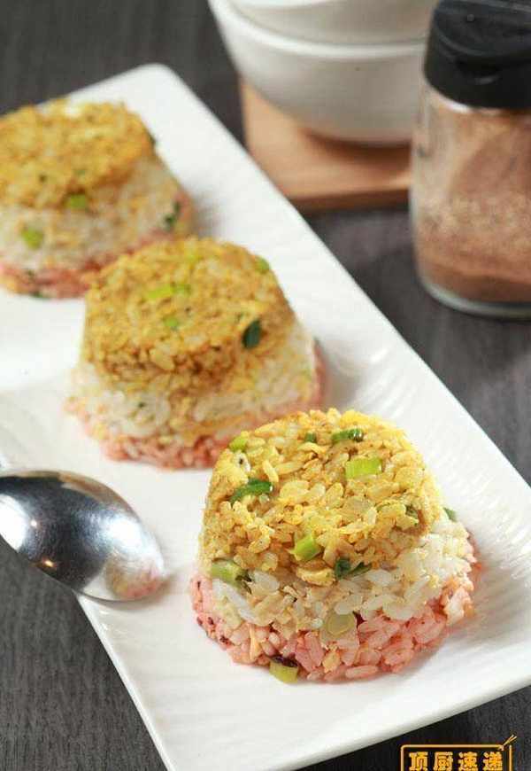 将炒好的炒饭分3份,其中2份分别加入红麴酱、咖喱粉后拌匀。接着依序将咖喱、原味、红麴炒饭分别装入塔模后压紧,再倒扣于盘中,即完成。