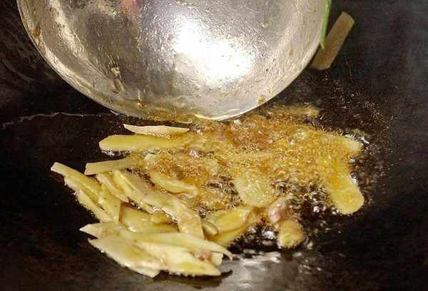 热油锅,加入两匙麻油与老姜爆香,要炒得干爽,把老姜的水分都炒掉。