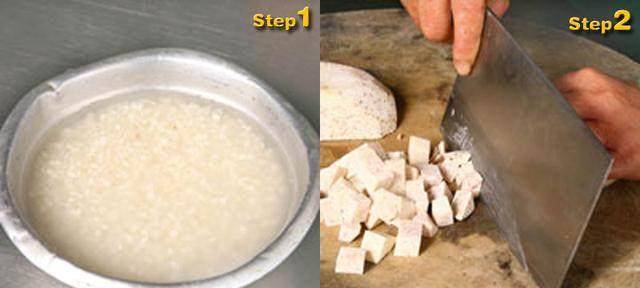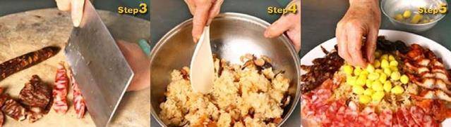Tips:两次蒸煮是为了让腊味食材的味道进到饭里,不可蒸太久,否则饭会太软烂。