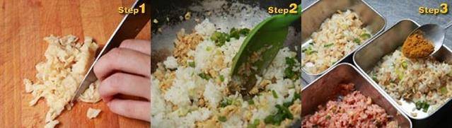 Tips:用汤匙将饭压紧,可让倒扣出的饭不会散掉;若家中无塔模,可使用小饭碗替代。