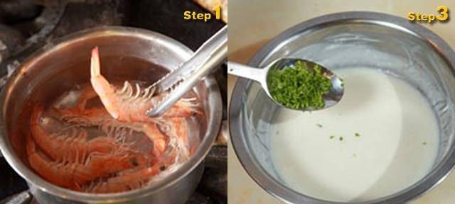 鲜虾洗净,放入滚水中汆烫至虾身转红熟透,并捞起冰镇约3分钟,再剥去外壳备用。