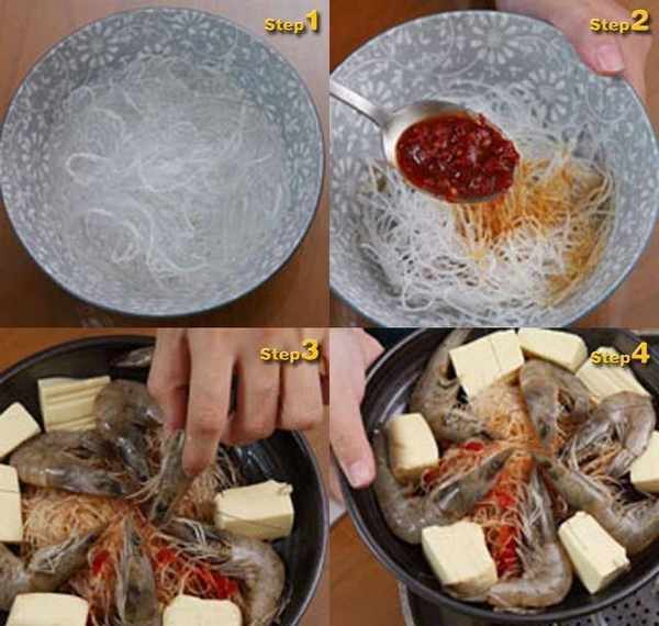 冬粉上方放入切块的鸡蛋豆腐与跟白虾。