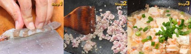 加入切好的虾仁拌炒至微变红色,续加入豆腐及所有调味料拌炒。最后撒上葱花,拌炒数下即可起锅。