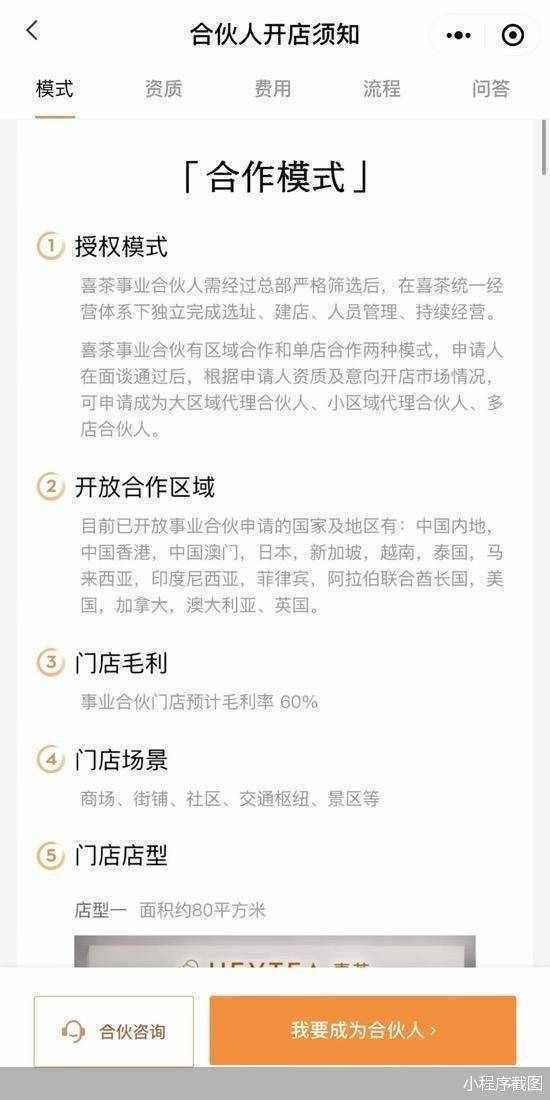 去年11月,喜茶宣布在非一线城市以合适的店型展开事业合伙业务,透露出其伸向下沉市场的信号,现在的喜茶,又打起了海外市场的“算盘”。喜茶事业合伙助手小程序显示,喜茶对于国内外开放加盟市场的条件相同,似乎对于海外市场的加盟业务同样较为谨慎。
