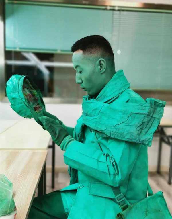 军绿色的帽子、上衣、裤子、斜挎包带着上世纪60、70年代着装特色,长长的围巾做成随风飘动造型,涂满绿色戏剧定妆粉的脸上,眼睛里布满血丝,一笑就露出一口大白牙。