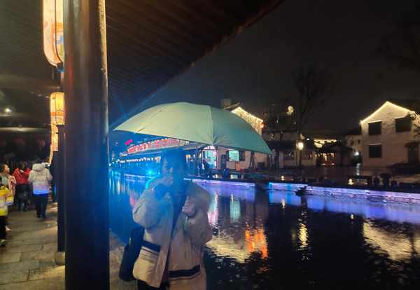 能觅一隅逸地,偷得浮生一夜闲,也是心之所向,极佳的选择。江南的小雨不太缠绵不知什么时候转为了中雨,带着北方入冬的时料峭,一家三口在古镇中,撑着伞,独家欣赏灯光秀,水幕电影,岸边淡淡的水汽犹如腾去驾雾般让我们踏入一抹尘烟,烟雾缭绕千里烟波的梦里水乡,这里便是藏在绍兴的柯桥古镇。