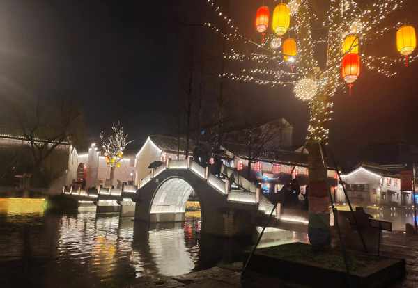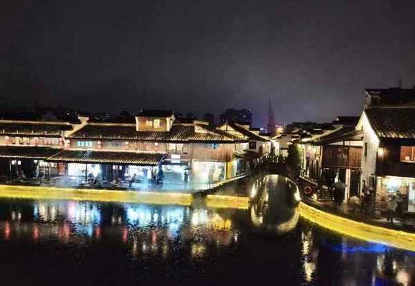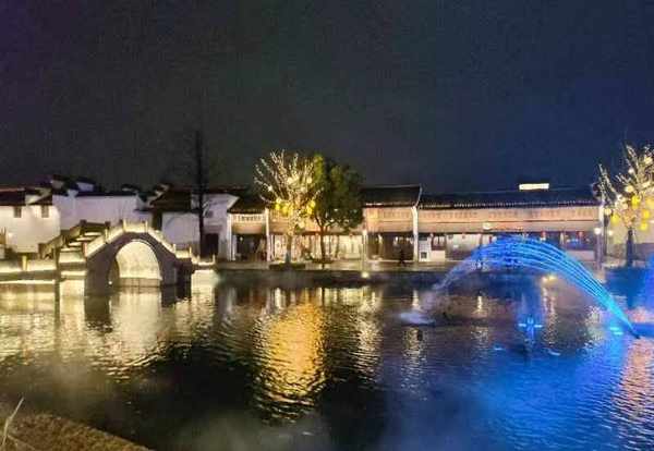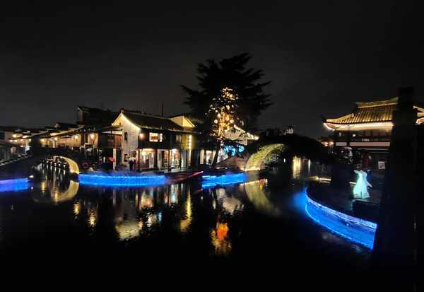 夜里看不清古镇青石街面,粉墙黛瓦,倒影小桥,更多的感觉是越过千年,踏古而新,古朴与现代完美交融。