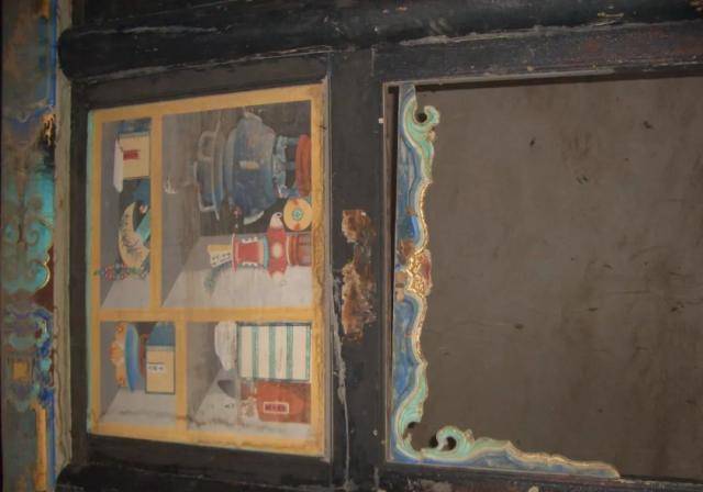 后金柱间设木结构隔断,将舞台划分为前后两部分,名曰“前台”、“后台”,隔断两侧各设一门为前后台通道,俗称“上场门”和“下场门”。前台进深一般4.5—5.5米,顶部设天花及藻井,两山墙绘壁画;后台进深2.5—3米左右,后墙两次间设高窗,两山墙后部辟便门供演员上下。前台明间为表演区,两次间称“辅台”,置伴奏席位。这种戏台表演区空间较大,在平遥地区留存甚多。