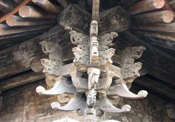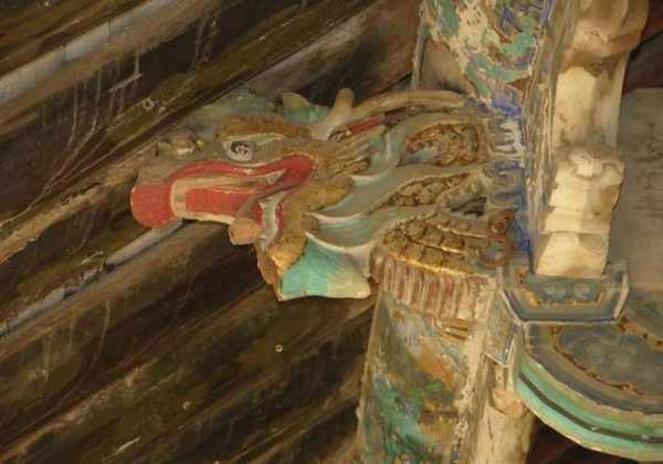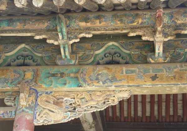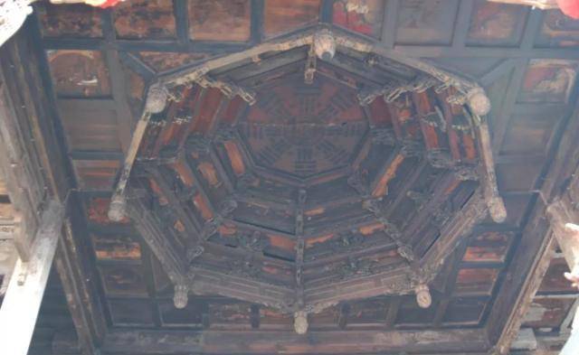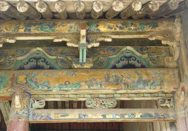 戏台梁架多为露明造,几乎所有木构件都要油饰彩绘,尤其檐口部位往往采用沥粉贴金工艺,戏台前台明间上施天花,井格内同样彩绘,或动物花卉图案,或戏曲故事人物图案。身临台上仿佛进入艺术宫殿,给人以艺术的享受。