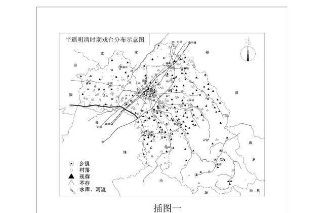 据近期不完全调查统计,由于战乱和自然灾害以及人为毁坏,平遥县境目前尚存有明清戏台158座(其中含灯影台5座),主要分布于县城东南丘陵、山区之乡村;已毀不存的180余座,地处汾河边和汾河故道平川乡村地带,因水患频发多数没有保存下来(插图一)。