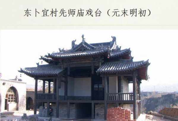 平遥东卜宜村先师庙戏楼是一座面阔、进深各三间的重檐歇山顶舞楼形制的建筑。戏台台基高出地面一点五六米,通宽十点九米,进深九点四米。台身三面砌墙,墙外回廊环绕,廊柱十二根,廊深一点五八米,台前出歇山抱厦,山花向前,柱吊垂莲,回廊自左右围拢,矮栏杆装点,台面呈“凸”字形,三面敞开。