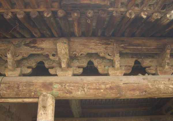砖木结构式三开间戏台梁架结构的最大特点,就是比较普遍地采用移柱造。即将前檐平柱移向两侧,上施跨海枋承托四(五)架梁,形成移柱造。采用移柱造作法扩大了表演区的面积。