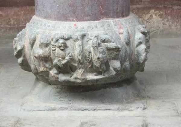 石雕工艺主要体现在前檐柱石柱础上,平遥戏台柱础皆由古镜式础石和覆盆石上下两部分构成,础石表面大都高浮雕人物故事、动物花卉等富有内涵寓意的吉祥图案。东安社关帝庙戏台的柱础雕有三组立体图案,麒麟送子、双狮戏球、白鹤戏松,造型栩栩如生,形象迫真。特别是糼狮戏耍形态;或昂首扬蹄,或戏闹翻滚。母狮则慈目相望,竭尽母爱之态。皆精雕细镂,精妙绝伦,其细微之处又皆匠心独运,风格迴异,各具精妙。