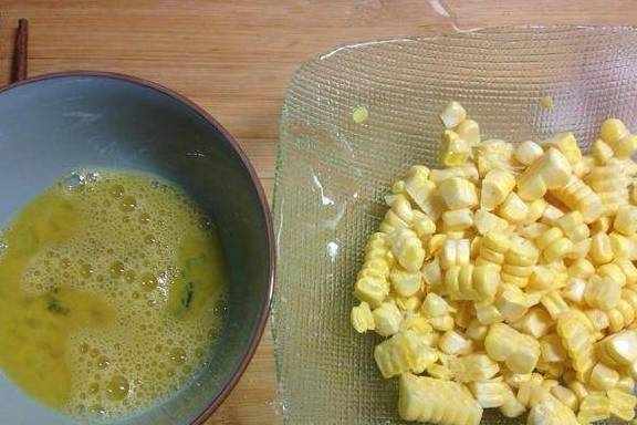 玉米粒用刀切下来,鸡蛋放一点盐,打成鸡蛋液备用