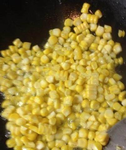 锅内热油,先把玉米倒进去放一点点盐,炒到玉米噼里啪啦的把鸡蛋液倒进去