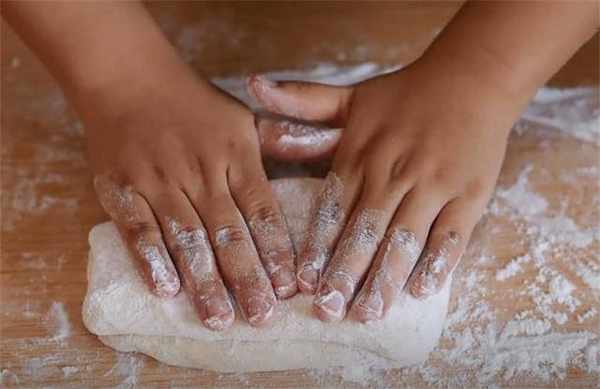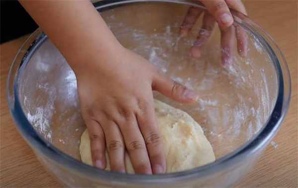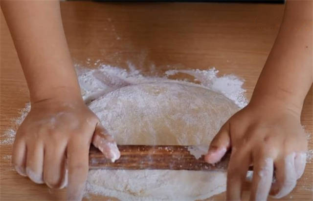 3.现在我们处理一下刚才和好的面团,案板上撒些干面粉防粘,用擀面杖擀开。