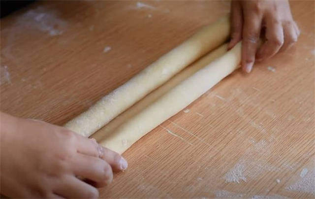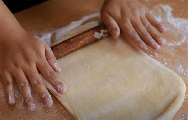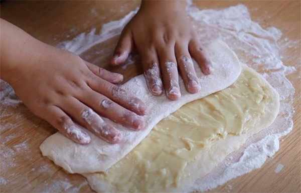 7.擀好之后我们按照刚才的方法再次折叠,然后再次擀开,这个过程就是开酥了。