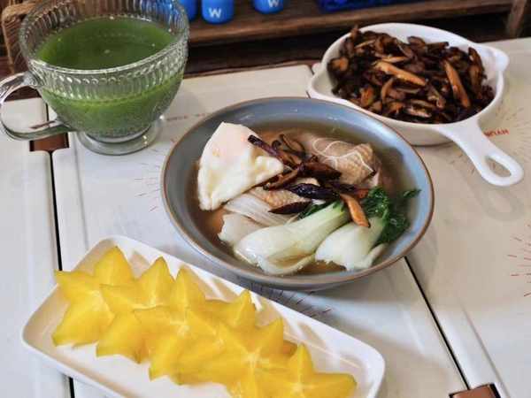 在过去半个月里,姜庆霞辗转至上海和广西南宁出差,在刚刚返回家中的第二天,就迫不及待的开始在朋友圈里分享自制早餐。她在这一碗老母鸡鸡汤面线里加上一个荷包蛋,用鸡油煸了香菇做配菜,又仔细切好了一碟杨桃、冲好了一杯青汁。一顿营养丰盛、色泽诱人的早餐就完成了。