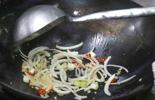 Step2:将洋葱丝与葱段、蒜末、辣椒末爆香,肉丝和酸菜丝汆烫4、5秒。