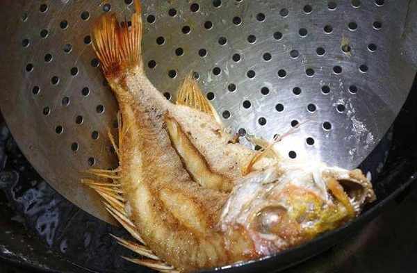 Step1:赤鯮鱼下锅后,加入50c.c.的油,以中火酥炸12分钟,至外皮呈金黄色。