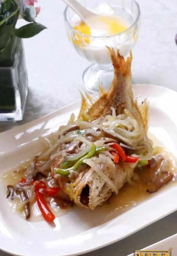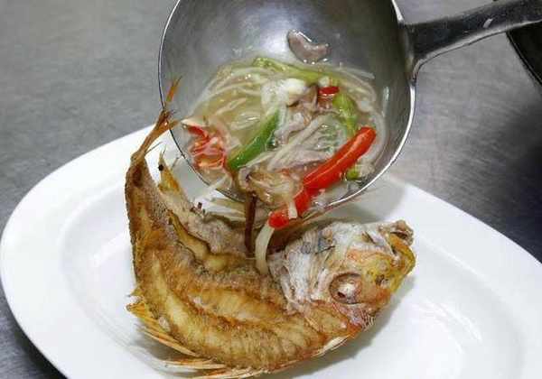 【五柳赤鯮】食材:赤鯮鱼1尾、洋葱丝100克、肉丝100克、酸菜丝100克、红萝卜丝100克、青椒丝100克、葱段适量、蒜末适量。调味料:糖150克、白醋100c.c、黑醋适量、香油适量、辣椒末适量