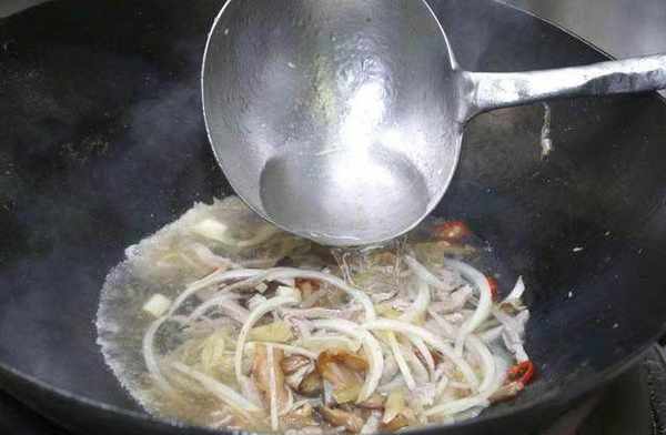 Step3:300c.c.的水倒入锅内加热后,加入糖与白醋调味,再把洋葱丝、红萝卜丝、青椒丝、肉丝和酸菜丝下锅拌炒30秒,起锅前加少许黑醋、香油。